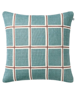 Raha är ett kuddfodral i storlek 50 x 50 cm med ett geometriskt mönster i färgkombinationen ljusblå och terrakotta. Ett modernt rutmönster som är handtryckt på ett linnetyg med vacker struktur. Enfärgad baksida och innerkudde ingår ej.